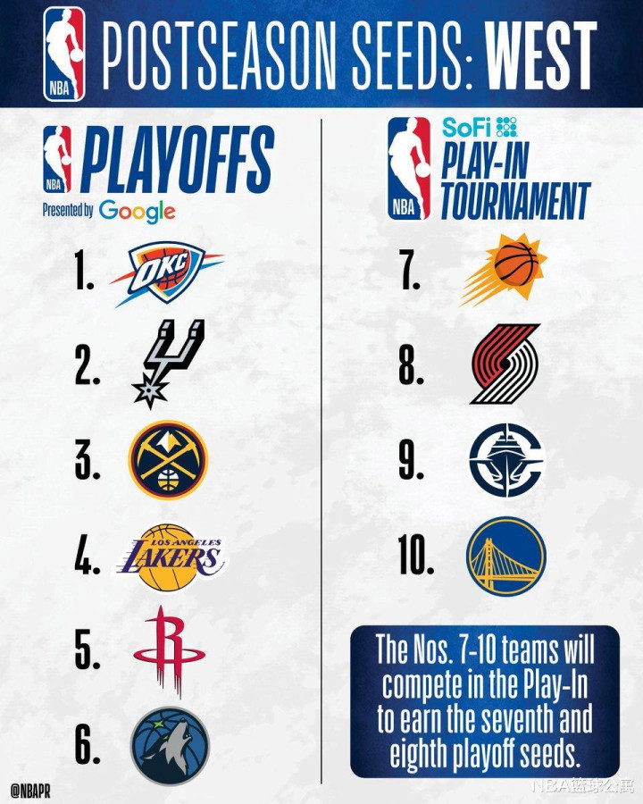 北京时间4月13日,NBA常规赛正式落下帷幕。西部赛区前十的最终排名依次为:雷霆队(64胜18负)、马刺队(62胜20负)、掘金队(54胜28负)、湖人队(53胜29负)、火箭队(52胜30负)、森林狼队(49胜33负)、太阳队(45胜37负)、开拓者队(42胜40负)、快船队(42胜40负)、勇士队(37胜45负)。鹈鹕队、独行侠队、灰熊队、国王队、爵士队则无缘季后赛。