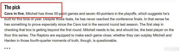 官网之所以认为骑士会一边倒晋级,根本原因是球星差距,猛龙队依靠锋线群有希望每场比赛都拖入关键阶段,但进入决胜时刻,猛龙队没人能够解决米切尔+哈登,骑士队显然占据绝对优势。